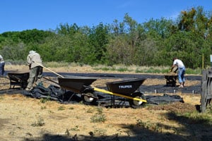 “Community and connections make good things happen. Stephen and Cindy needed to think of me for this project; I needed Jodi Padgett, with whom I share life and land, to agree with the idea that we could plant the milkweed on the property; I needed to find someone to plough and level the planting areas; I needed volunteer help almost every step of the way. I needed Brianna Borders of the Xerces Society to support me when needed. Food and wine is usually a great incentive for volunteers, but that’s not all – realizing that there is, as Rachel Carson said, “something beyond the bounds of our human existence” worth paying attention to is probably more of an incentive for every single one of the volunteers who came and knelt, and dug, and laid weed barrier fabric, and connected irrigation parts, and invented hole-burners and augers, and finally, tenderly, popped these little milkweed plugs into the earth with a silent prayer that each one would grow strong. All of this work was done in unusually hot weather. The youngsters took much needed breaks by splashing around in the swimming pool; the elders sat in the shade gulping down iced mint tea. Everyone got hot, sweaty and very dusty.”